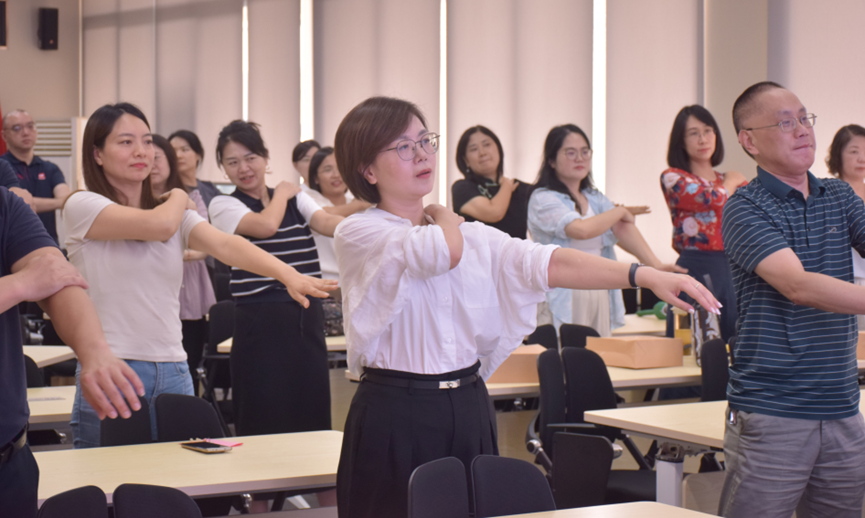 活动现场设置了中医经络仪体质检测、健康养生讲座、传统养生操教学、中医专家一对一咨询以及非遗漆扇制作体验五大板块。教师们不仅在专业医师的指导下学习八段锦、五禽戏等传统养生功法,还通过智能设备进行体质辨识,体验个性化健康评估,真切感受到“智慧康养”的科技魅力与人文温度。