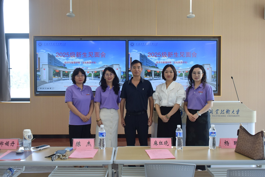 图:经济与管理学院党总支副书记、副院长麻红晓,重庆金佛山山水文旅发展集团有限公司(金佛山文旅集团)经营管理部部长杨珊,陈杰、郑媚丹、刘钰佳,参加2025级新生见面会