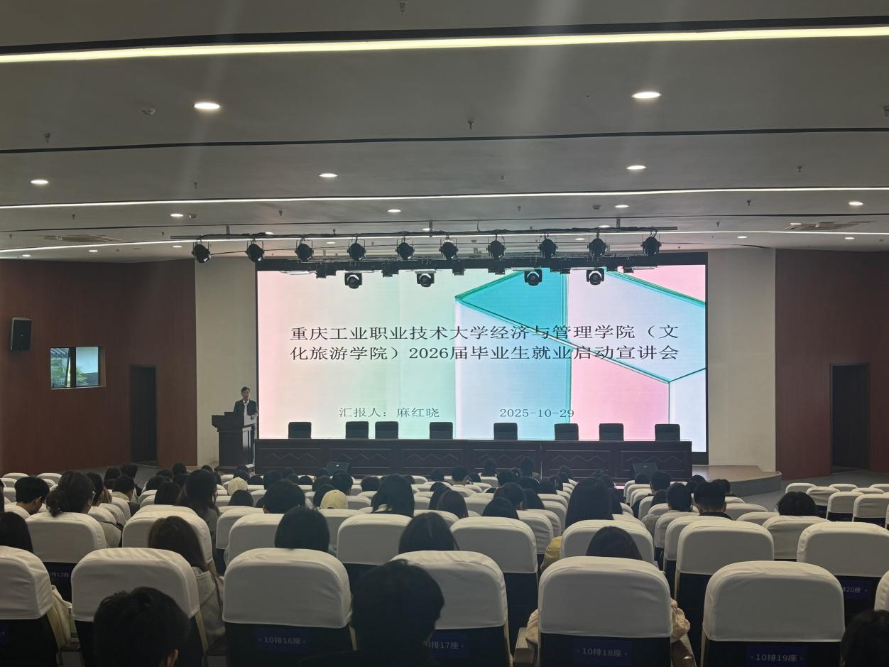 为响应国家就业优先战略,促进毕业生高质量就业,引导学生理性择业,经济与管理学院(文化旅游学院)于2025年10月29日在渝北校区第三报告厅召开2026届毕业生就业启动会。会议由经济与管理学院(文化旅游学院)党总支副书记麻红晓书记主持,全体毕业班辅导员和2026届毕业班学生参加会议。