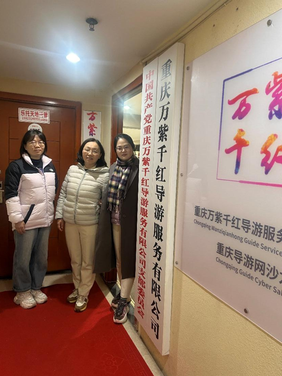随后,教师团队来到位于渝中区的重庆市万紫千红导游服务有限公司,与总经理管延龙进行座谈。作为学校旅游管理专业的外聘专家教师,管延龙对双方此前在多语种导游志愿服务、专业核心课程教学等方面的合作成果予以肯定。双方结合当前文旅行业数字化发展趋势,就进一步深化校协合作展开探讨,并计划邀请行业资深导游参与课堂教学,开展新媒体导游技能培训,提升学生的行业适配能力。教师团队还重点了解了协会对导游人才的需求标准,为优化专业课程设置收集一线反馈。