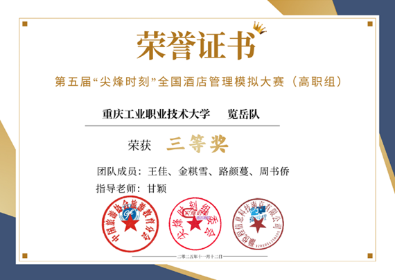 近日,由中国旅游协会旅游教育分会、灏悦程信息科技南京有限公司及尖烽时刻组委会联合主办的第五届“尖烽时刻”酒店管理模拟大赛(高职组)圆满收官。本次大赛吸引了全国22所院校48支团队、183名学生参赛,参赛队伍中包括了青岛酒店管理职业技术学院、浙江旅游职业学院等院校,我院学子与标杆院校同台竞技,收获良多。